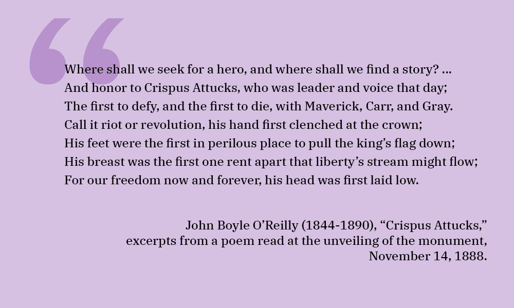 The monument was unveiled on the Boston Common in 1888 after blacks built a broad coalition of supporters, including Irish Americans like poet and editor John Boyle O’Reilly (1844-1890) and Boston Mayor Hugh O’Brien (1827-1895). In the end, organizers positioned the monument as honoring all the victims of the Massacre, not just Attucks. As African Americans and Irish Catholic immigrants struggled to find their place in city politics during the 1890s, they found inspiration in the heroism of Attucks and his fellow Massacre victims, including Irishman Patrick Carr.