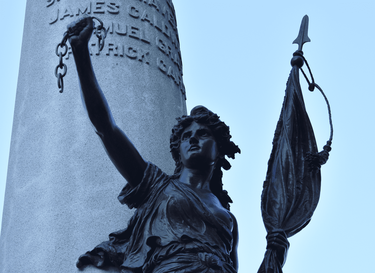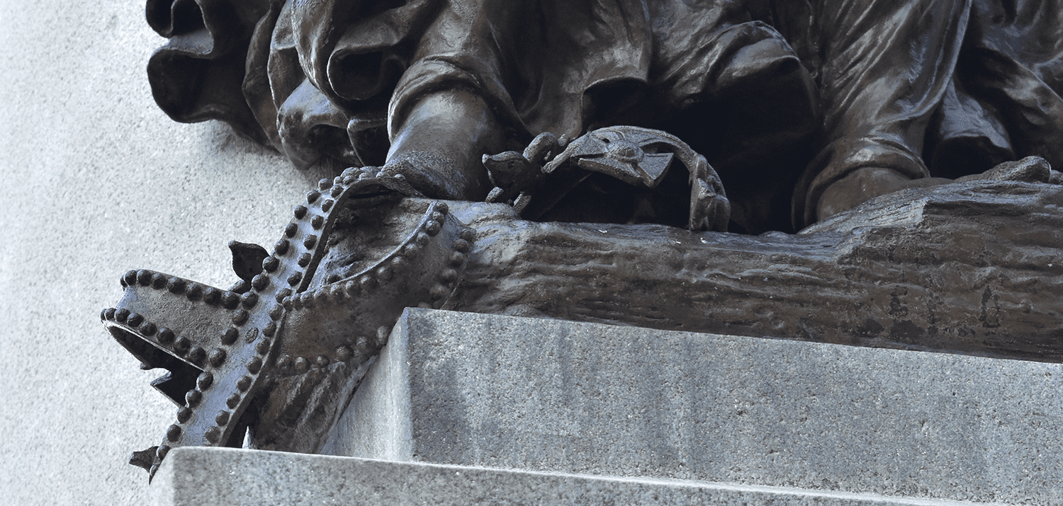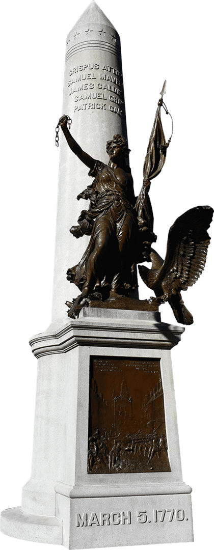 Erected in 1888, the Boston Massacre monument connects the ideals of the Revolution to the abolition of slavery in 1865. The base of the monument shows Crispus Attucks as the central figure in the Massacre. At the top sits the Spirit of the Revolution, an allegorical figure. She holds the broken chains of slavery in her right hand and a flag in her left hand. The British crown is crushed beneath her right foot.