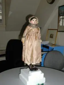One lesser known fact about the ships involved in that fateful act is that they carried a variety of cargo in addition to tea, such as books and toys. Among the items brought for sale was a fashion doll made of English oak and dressed in beautiful clothing, including a brocade dress and hat with ostrich feather.